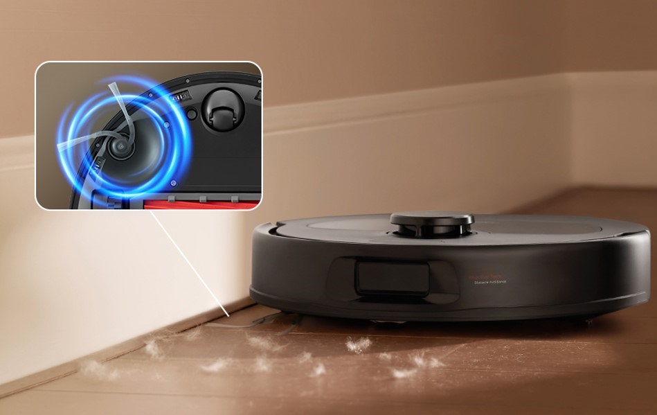 Основна силіконова турбощітка ефективно збирає забруднення з різних типів покриттів та адаптується до нерівностей підлоги. Її конструкція зменшує намотування волосся та спрямовує сміття безпосередньо до пилозбірника. Додаткова бокова щітка очищає кути та простір уздовж плінтусів.