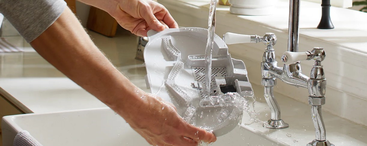 Також база виконує роль зарядної станції, завдяки чому пристрій завжди готовий до наступного циклу прибирання. Знімний піддон легко очищується під проточною водою, що допомагає підтримувати гігієнічність системи.