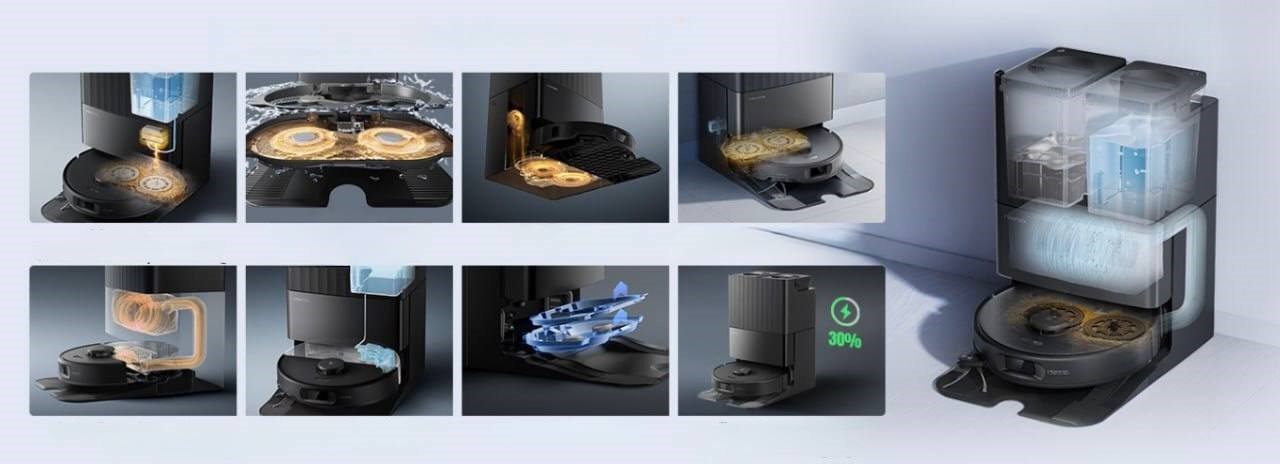 Багатофункціональна док-станція Dock 3.0 заряджає робот, очищує пилозбірник, заповнює бак водою, миє швабри гарячою водою та сушить їх гарячим повітрям. Інтелектуальна система оцінює рівень забруднення і при потребі повторює миття, забезпечуючи повну готовність до наступного прибирання.