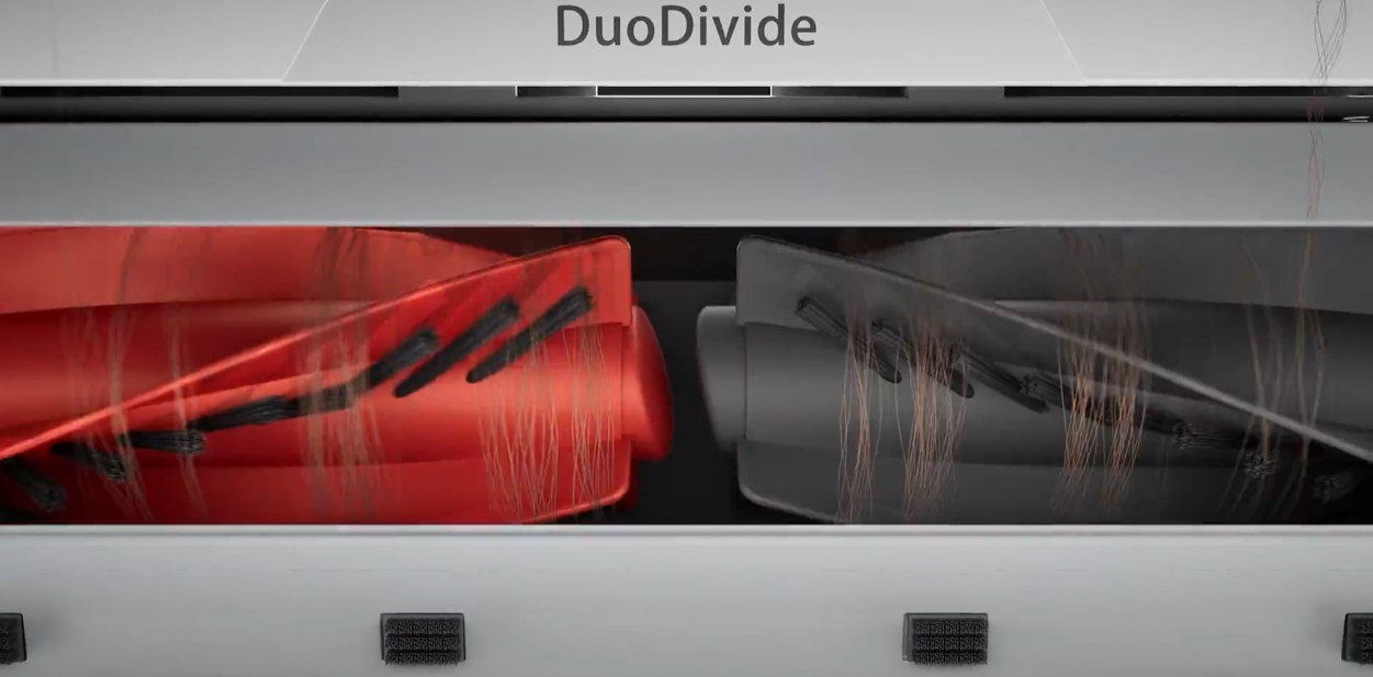 Основна щітка DuoDivide Brush із подвійними роликами та спіральними лезами направляє волосся прямо в сопло всмоктування. А асиметрична бокова щітка створює відцентрову силу, яка не дозволяє сміттю намотуватися і очищає важкодоступні місця. Обидві щітки сертифіковані SGS та TUV, гарантуючи стабільну продуктивність і надійний захист від заплутування.