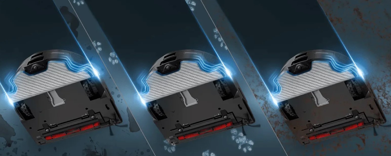 Вбудована вібраційна насадка для вологого прибирання допомагає видаляти плями і забруднення з твердих підлог. Це зменшує потребу в ручному митті підлоги після роботи робота.