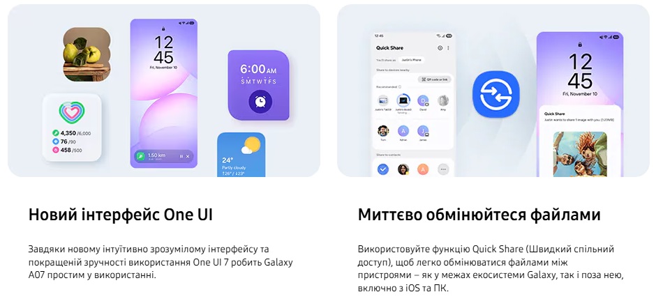Відкрийте собі всю потужність нового Galaxy A07, розробленого на базі передового 6-нм процесора, що прискорює багатозадачність. Легко транслюйте стрім, занурюйтесь у сучасні ігри, переглядайте фільми, спілкуйтеся та редагуйте медіа без найменших затримок – він буде таким самим швидким як усі улюблені розваги!