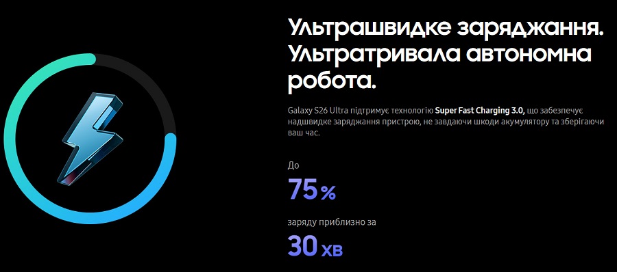 Galaxy S26 Ultra підтримує технологію Super Fast Charging 3.0, яка розроблена для блискавичного поповнення енергії без шкоди для ресурсу акумулятора. Отримайте до 75% заряду всього за 30 хвилин підключення до мережі.