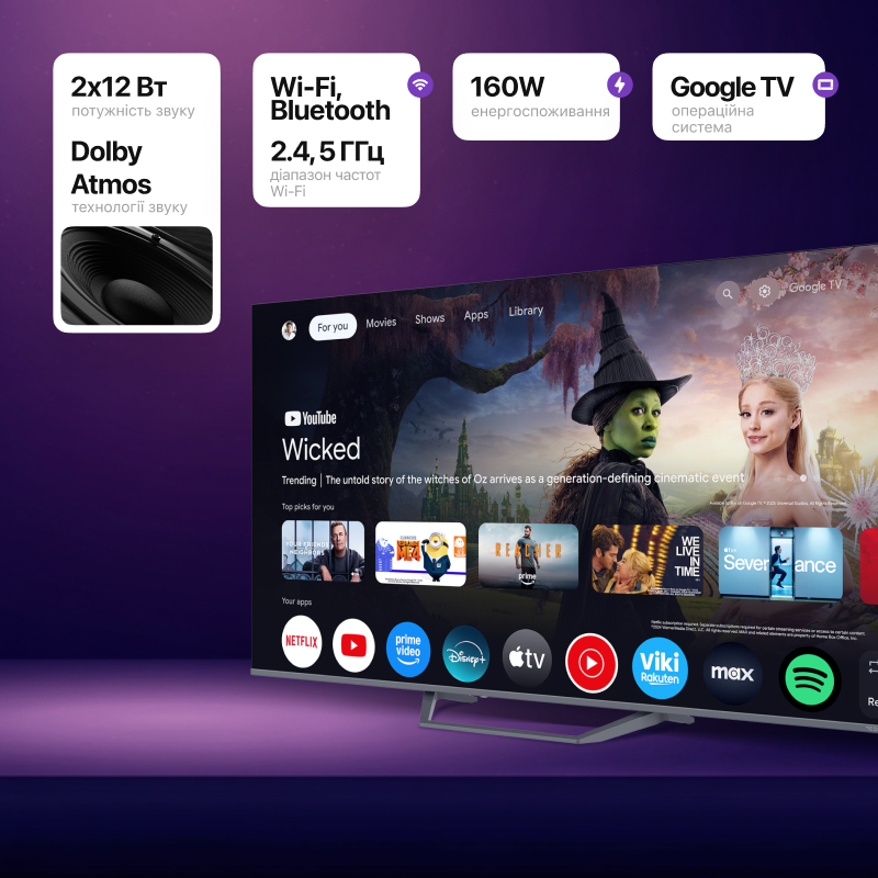 Google TV змінює уявлення про перегляд: усі ваші стрімінгові сервіси, прямі канали й додатки в одній інтуїтивній платформі. Персональні рекомендації, доступ до понад 10 000 додатків — серед яких Netflix, Disney+, Prime Video, YouTube, Apple TV, HBO Max — і підтримка Google Assistant забезпечують швидкий доступ до будь-якого контенту одним натисканням кнопки чи голосовою командою.