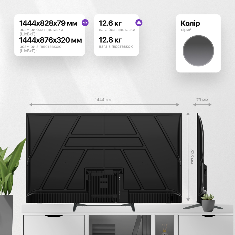 | Розміри без підставки (ШхВхГ): | 1444х828х79 мм |