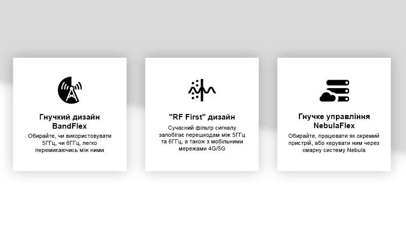 "RF First" дизайн: Сучасний фільтр сигналу запобігає перешкодам між 5ГГц та 6ГГц, а також з мобільними мережами 4G/5G. Гнучке управління NebulaFlex: Обирайте, працювати як окремий пристрій, або керувати ним через хмарну систему Nebula.