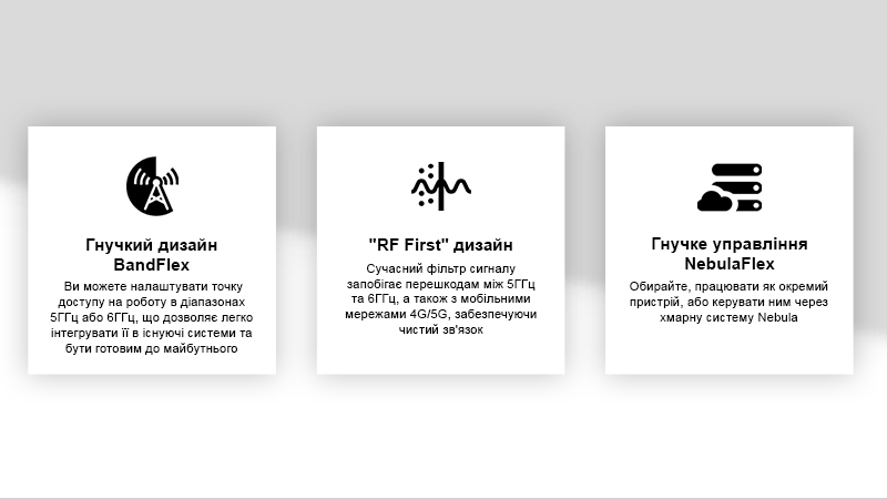 - BandFlex: Ви можете налаштувати точку доступу на роботу в діапазонах 5ГГц або 6ГГц, що дозволяє легко інтегрувати її в існуючі системи та бути готовим до майбутнього.