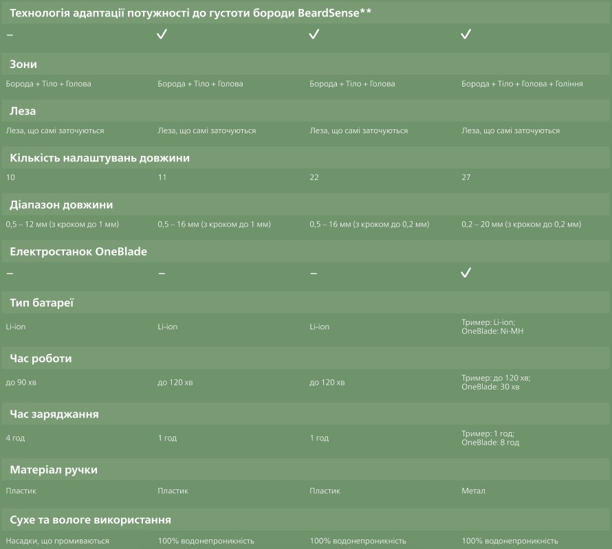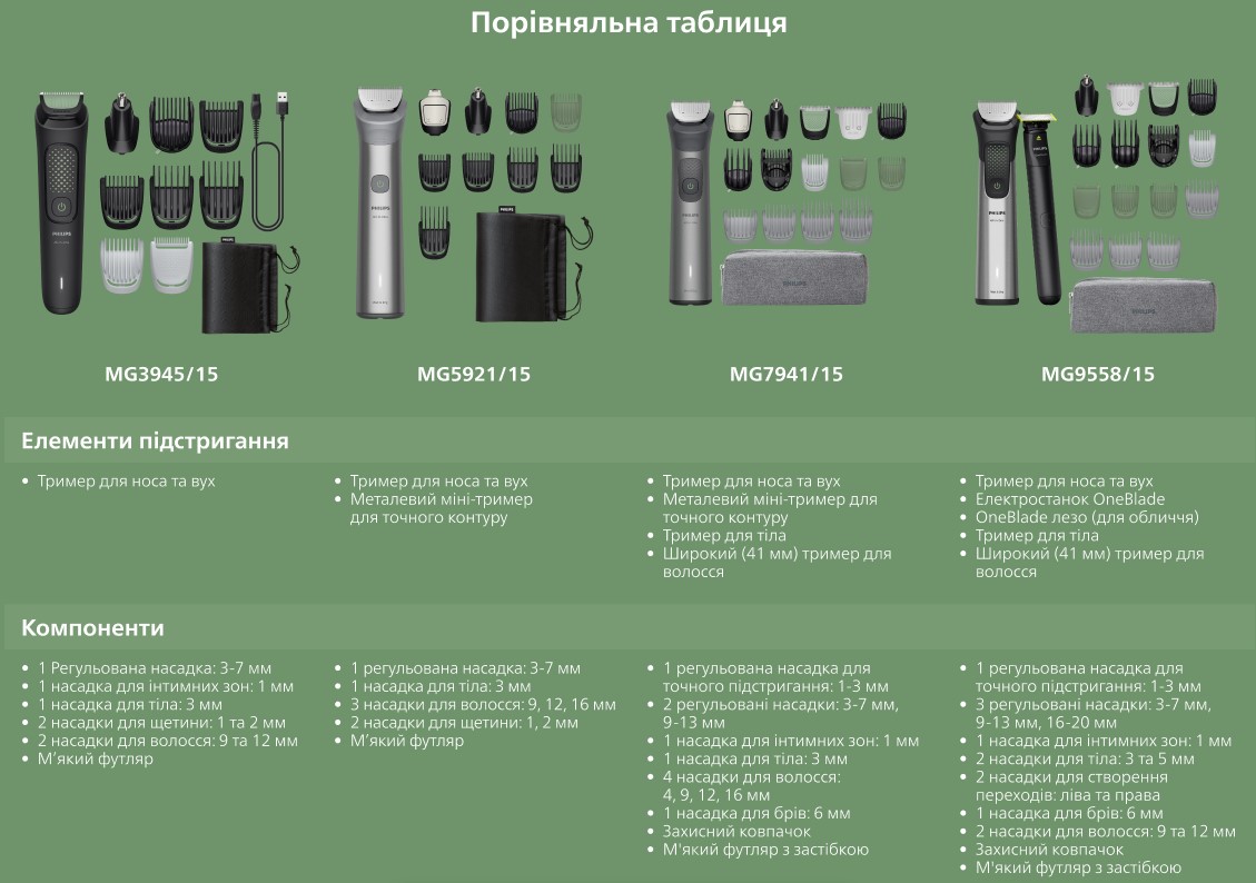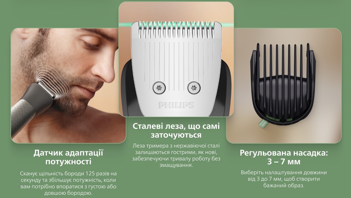 Робить все що треба легко, результат відмінний волосся йде чисто шкіра не страждає, підрівнює рівно без дертя. Насадки міняються швидко, фіксуються добре. Легкий, зручний у руці, як на мене оптимальний варіант з філіпса по ціні і насадкам, все що треба є всі робочі, якість хороша, леза гострі якісні і по батареї повний порядок.