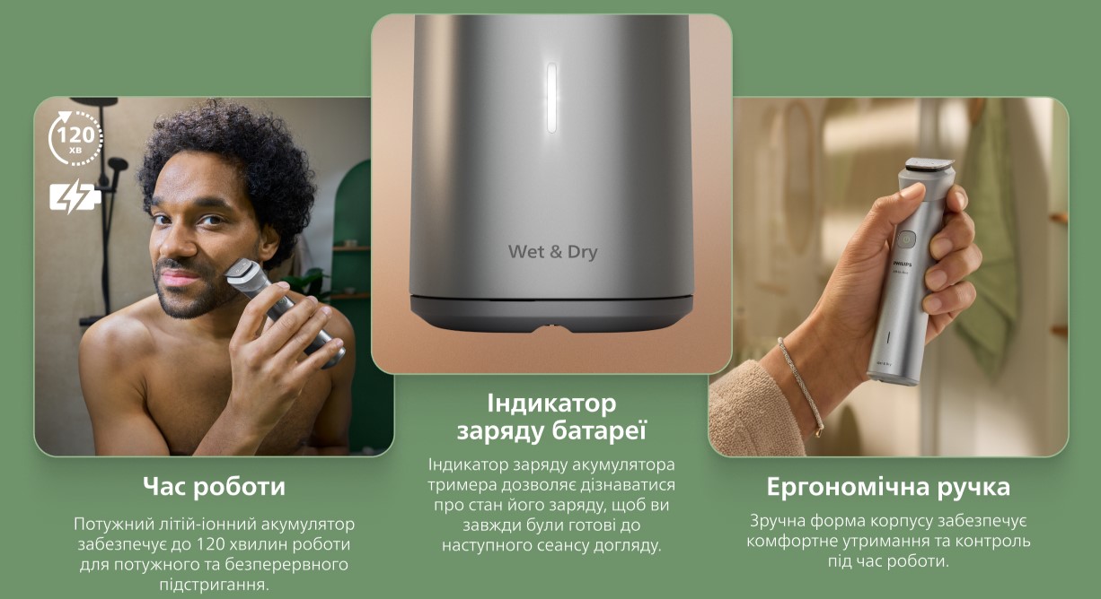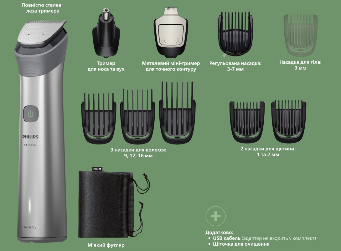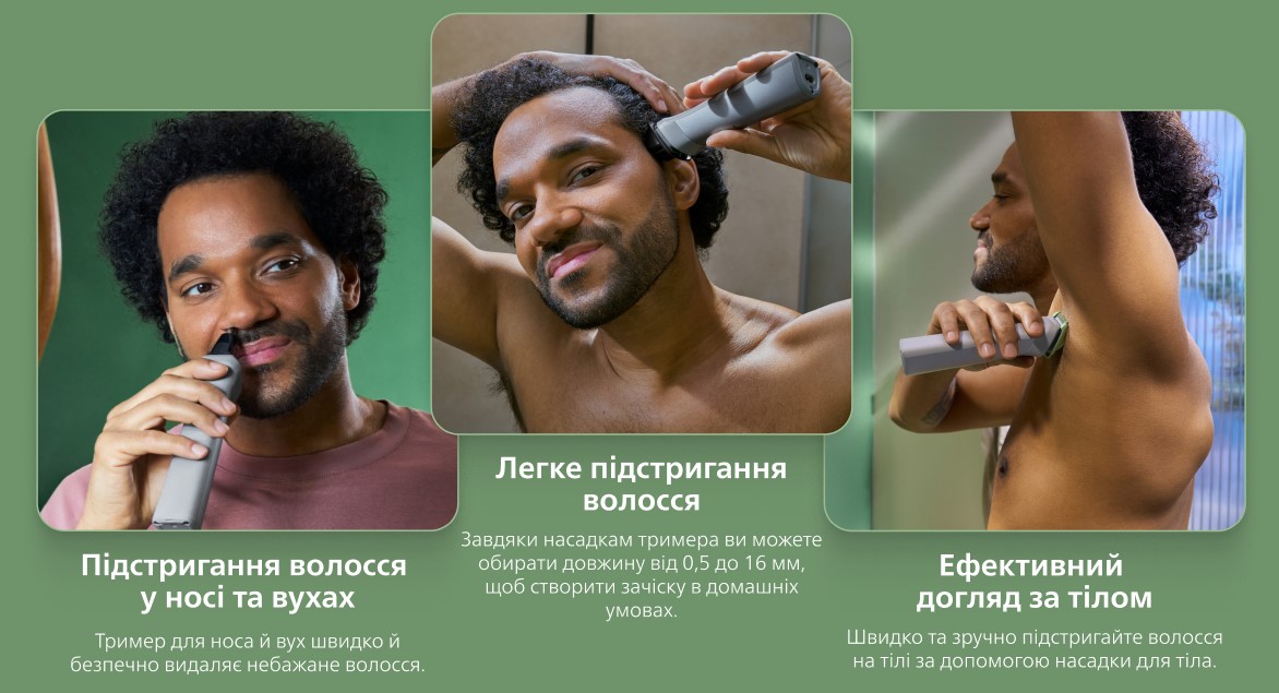 Наш тример оснащений інструментами, які дозволяють моделювати волосся на бороді, підстригати волосся на голові та доглядати за тілом, задовольняючи всі ваші потреби в догляді.
