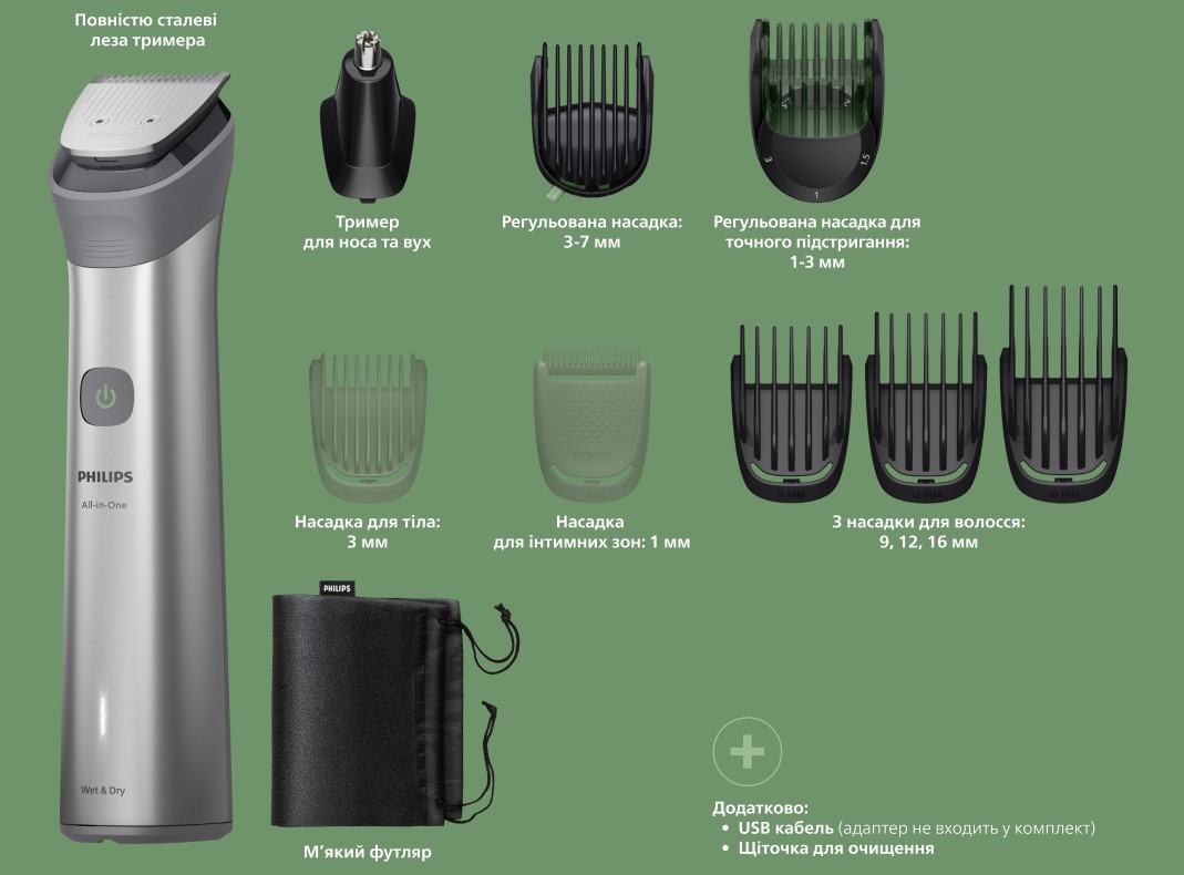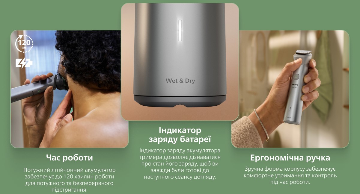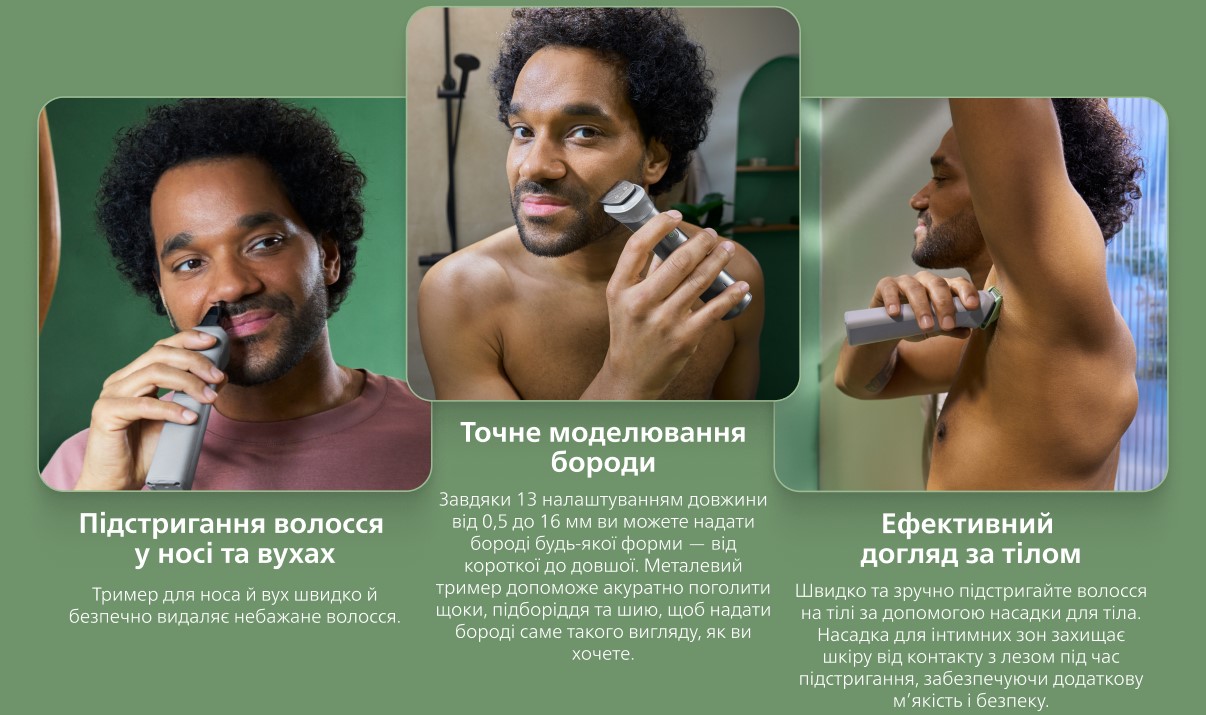 Наш тример оснащений інструментами, які дозволяють моделювати волосся на бороді, підстригати волосся на голові та доглядати за тілом, задовольняючи всі ваші потреби в догляді.