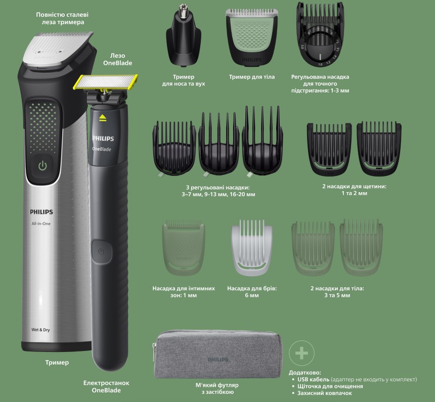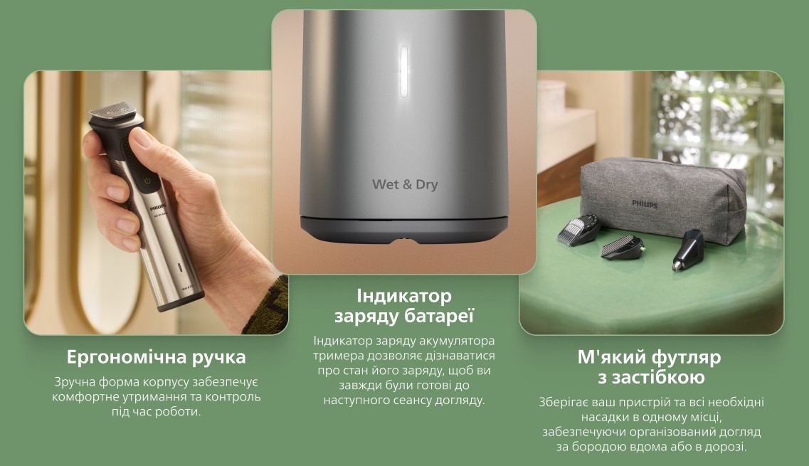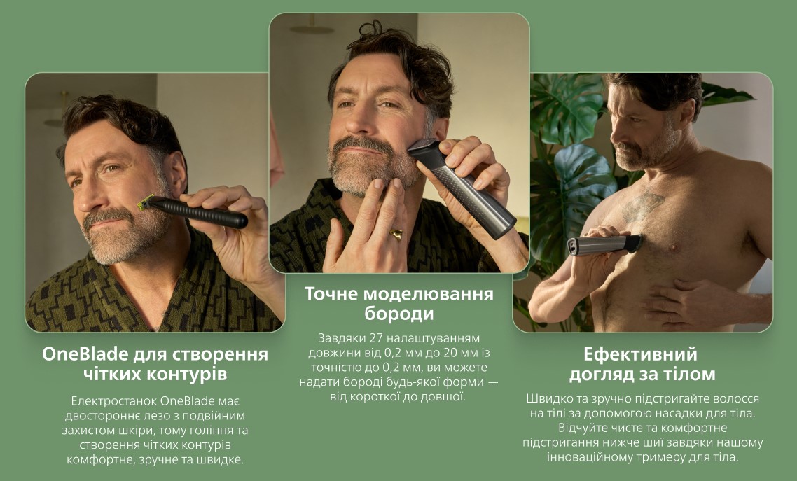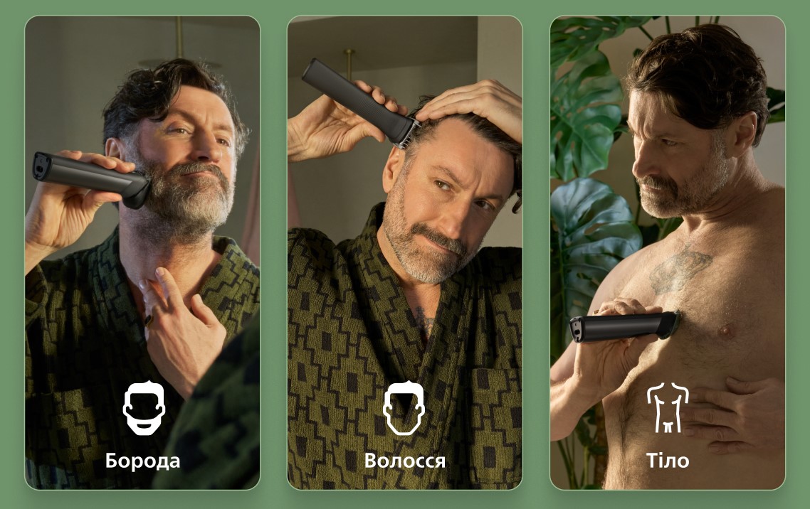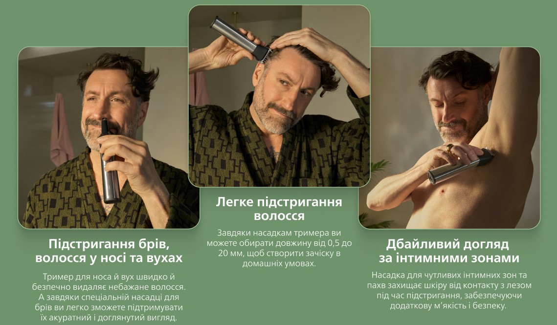 Наш тример оснащений інструментами, які дозволяють голити та моделювати волосся на бороді, підстригати волосся на голові та доглядати за тілом, задовольняючи всі ваші потреби в догляді.