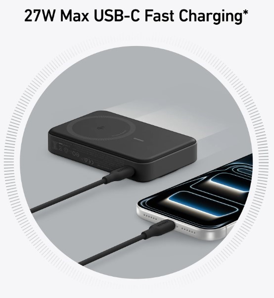 Завдяки порту USB-C Anker MagGo дозволяє швидко заряджати смартфони та сам павербанк. За рахунок потужності 27 Вт iPhone 15 може досягати приблизно 60% заряду за 30 хвилин.