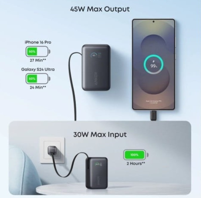 USB-C забезпечує 45 Вт вихідної потужності, а вхідний порт 30 Вт заряджає сам павербанк приблизно за 2 години. Наприклад, iPhone 16 Pro заряджається до 50% лише за 27 хвилин.