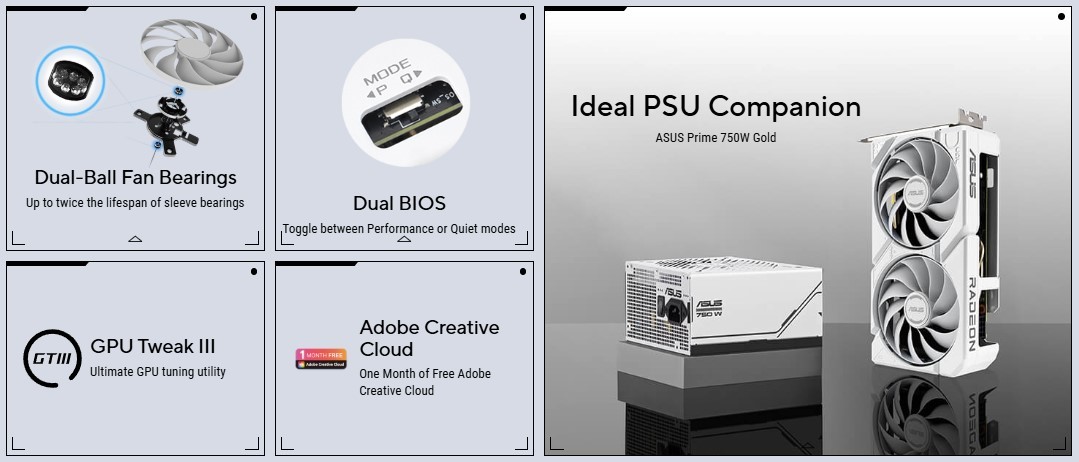 ASUS Dual Radeon™ RX 9060 XT White Edition поєднує потужну теплову ефективність із широкою сумісністю. Передові системи охолодження з флагманських відеокарт — зокрема два вентилятори Axial-tech для оптимізації повітряного потоку до радіатора. Створена у компактному форм-факторі 2,5 слота, забезпечує більше потужності в меншому просторі. Ці вдосконалення роблять ASUS Dual ідеальним вибором для геймерів, які хочуть потужну графічну продуктивність у компактному корпусі.