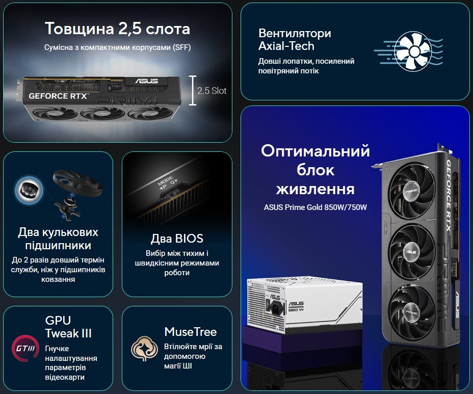 Відеокарта Prime GeForce RTX 5050 має 2,5-слотову конструкцію з ретельно продуманим розташуванням кожуха, радіатора й теплових трубок, що дозволяє трьом вентиляторам Axial-tech ефективно використовувати вентиляцію бічних панелей корпусу та забезпечувати оптимальні температурні характеристики.