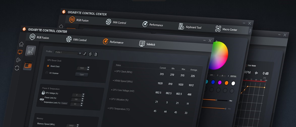 GIGABYTE CONTROL CENTER (GCC) — це універсальне програмне забезпечення для всіх підтримуваних продуктів GIGABYTE. Воно має інтуїтивно зрозумілий інтерфейс, що дозволяє користувачам у реальному часі налаштовувати частоту, напругу, режим вентиляторів і цільове енергоспоживання.