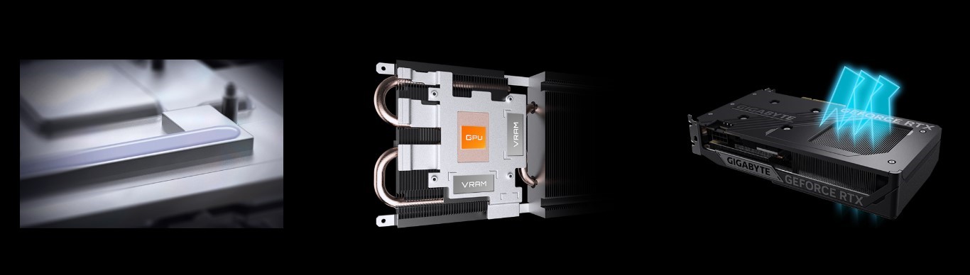 - Мідна пластина та композитні мідні теплові трубки: Мідна пластина безпосередньо контактує з GPU, у поєднанні з композитними мідними тепловими трубками, які швидко передають тепло від GPU і VRAM до радіатора.