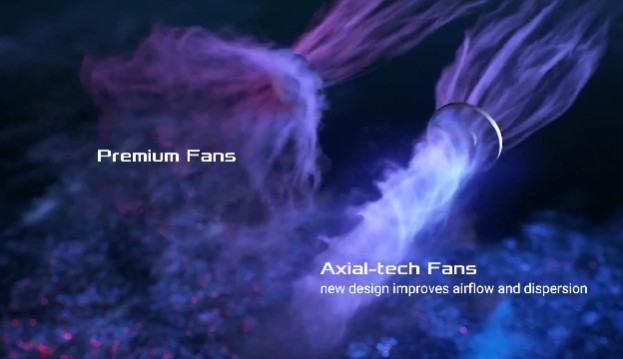 Три вентилятори Axial-tech мають зменшену втулку, подовжені лопатки та спеціальне кільце-обмежувач, яке допомагає збільшити тиск повітря в напрямку радіатора. Таким чином, досягається ефективне охолодження, висока продуктивність і низький рівень шуму.
