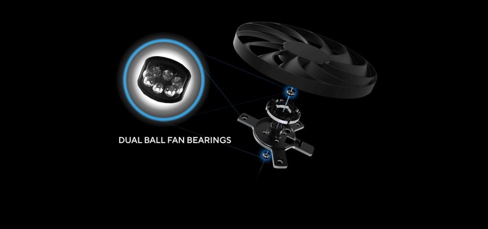Пара кулькових підшипників, які використовуються у вентиляторах цієї відеокарти, мають удвічі більший термін служби, ніж традиційні підшипники ковзання.