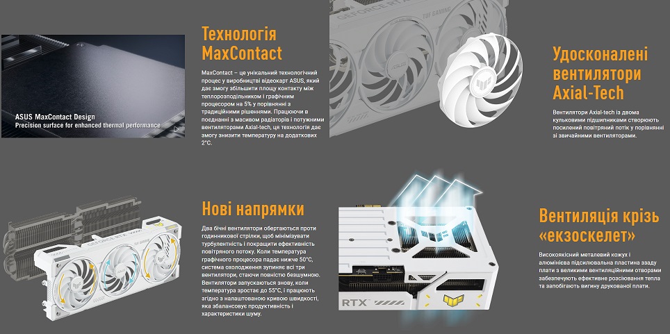 Сучасна система охолодження відеокарти включає ексклюзивну технологію ASUS MaxContact, термопрокладку для графічного процесора з фазовим переходом і високоефективні вентилятори Axial-tech, що забезпечують чудові температурні характеристики, оптимальний повітряний потік і тиху роботу – і все це в міцному металевому «екзоскелеті» з вентиляційними отворами.