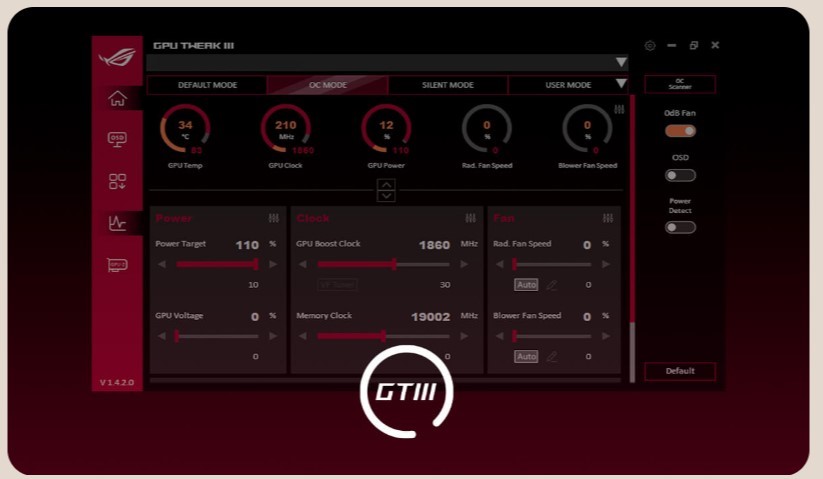 Утиліта ASUS GPU Tweak III виводить налаштування відеокарти на новий рівень. Вона дозволяє регулювати критичні параметри, включаючи тактову частоту ядра GPU, частоту пам’яті та напругу, з можливістю моніторингу всього в режимі реального часу через налаштовуване екранне меню. Також включено розширене керування вентиляторами та багато інших функцій, щоб отримати максимальну віддачу від відеокарти.