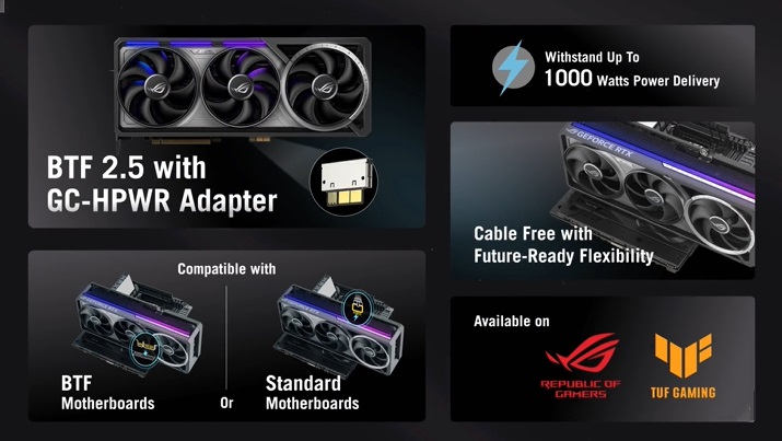 Відчуйте майбутнє складання ПК із серією BTF. Поєднання відеокарти, материнської плати та корпусу BTF відкриває повністю прихований роз'єм, усуваючи видимі кабелі для безпрецедентно чистої естетики. Удосконалений підхід BTF, що працює на базі слота високої потужності відеокарти на материнських платах BTF, забезпечує значну потужність. А тепер, завдяки нашій інноваційній конструкції адаптера знімної відеокарти високої потужності (GC-HPWR), відеокарти BTF пропонують неперевершену сумісність, безперешкодно працюючи як зі стандартними материнськими платами, так і з материнськими платами BTF. Крім того, покращений адаптер GC-HPWR тепер витримує до 1000 Вт, що забезпечує оптимальну продуктивність навіть для найвибагливіших графічних процесорів.